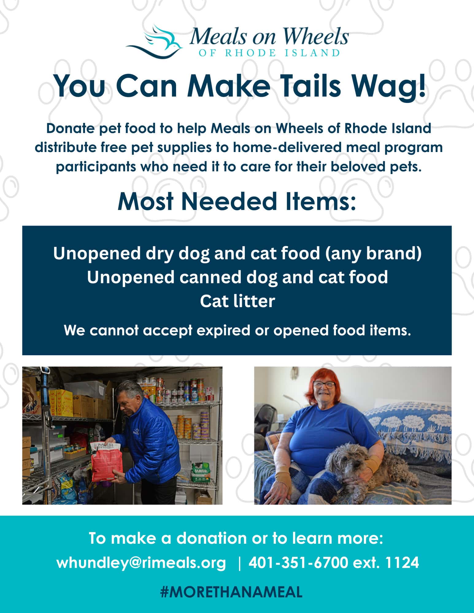 Meals on Wheels of RI is proud to provide pet food and supplies to homebound clients who need help accessing the resources to adequately care for their pets.